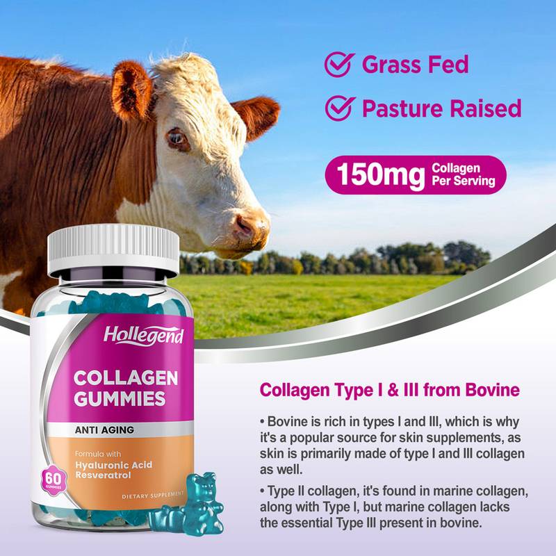 • Hydrolyzed Collagen Gummies: Hollegend Collagen is sourced from grass fed and pasture raised bovine, which is rich in Collagen Types I, III – the main collagen type in the skin. Collagen peptides are small protein that is better absorbed and improves bioavailability.