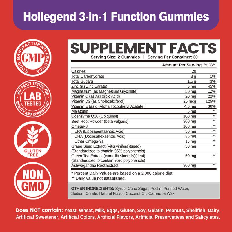 •  Non-GMO: Hollegend Gummies are non-GMO, made with organic sweeteners, and are free of artificial flavors, sweeteners, colors or preservatives